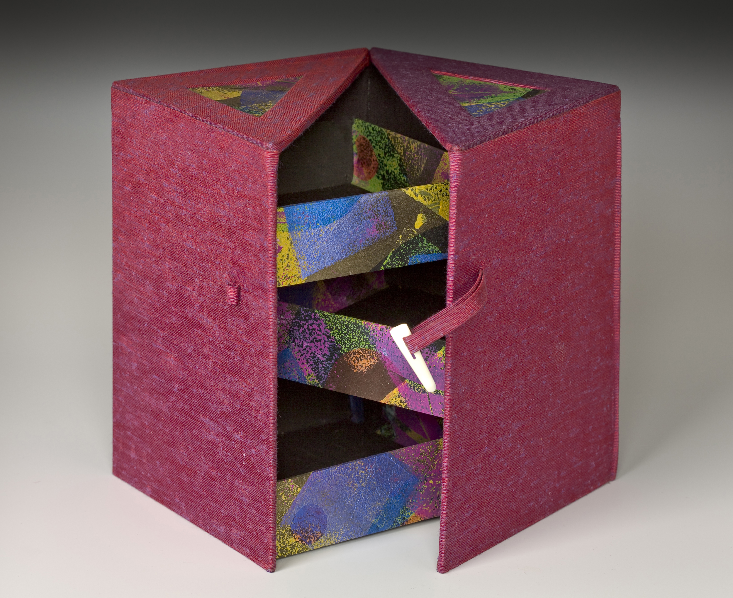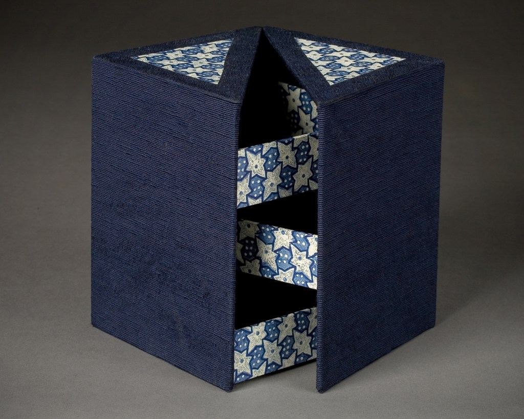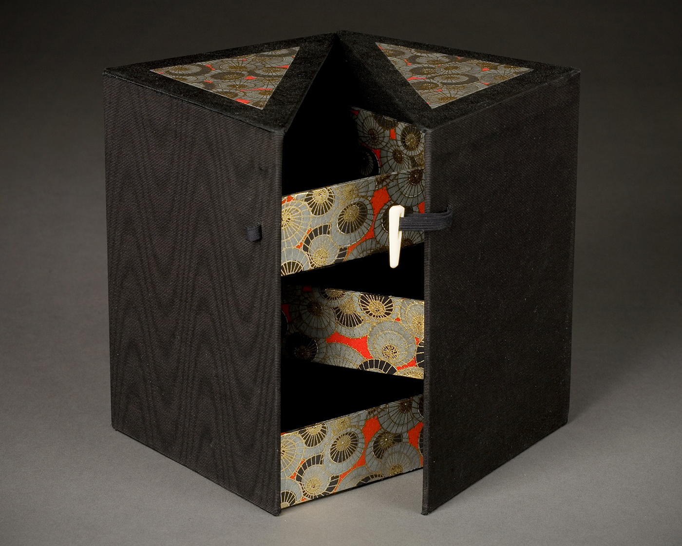 The simple cube shaped box divides on the diagonal and opens to reveal three interlocking drawers. Perfect for valuables or small collectibles. The outside of the box is covered with Japanese silk cloth and the drawers with a variety of matching papers. These handmade jewelry boxes may also be custom-ordered in a wide variety of different silks and papers.