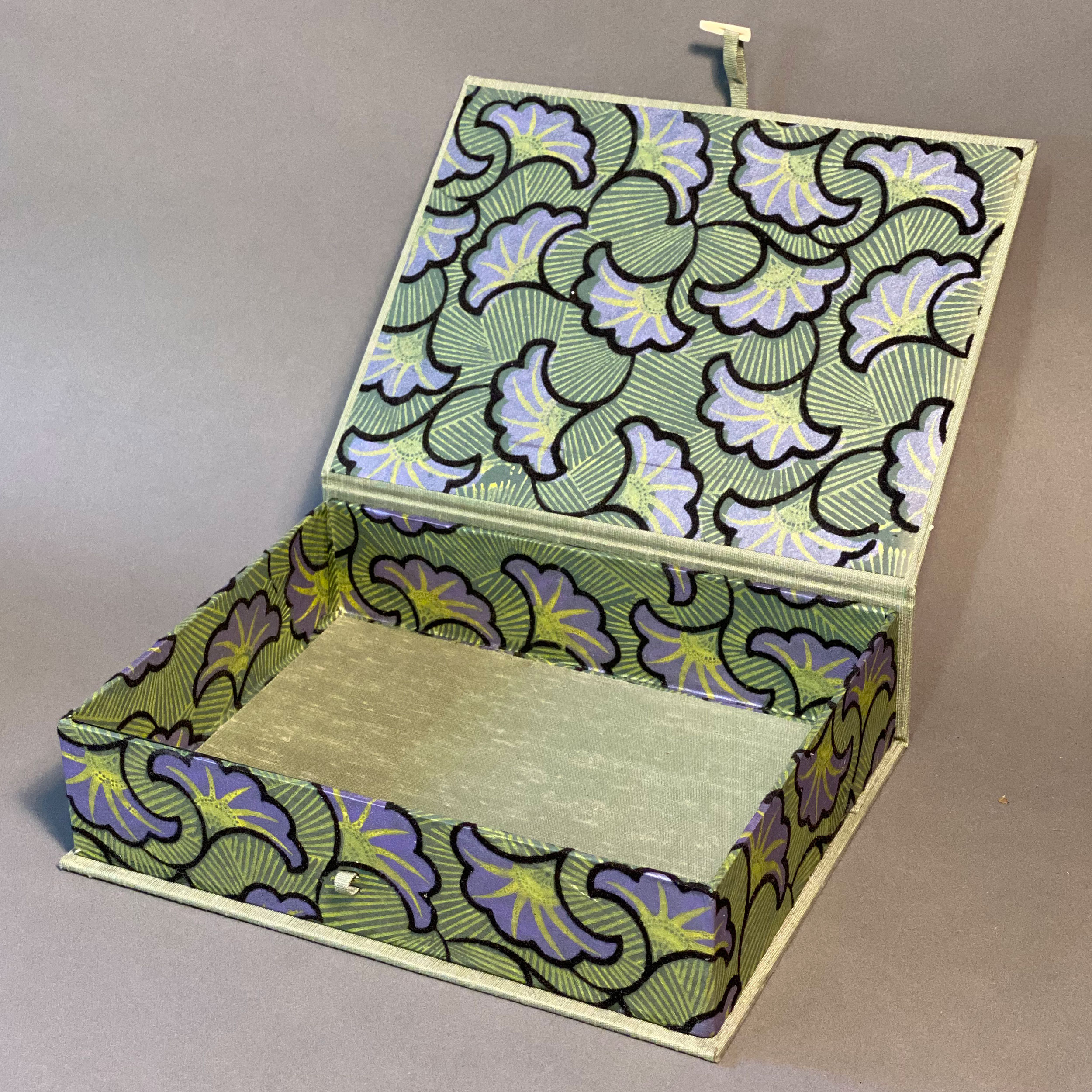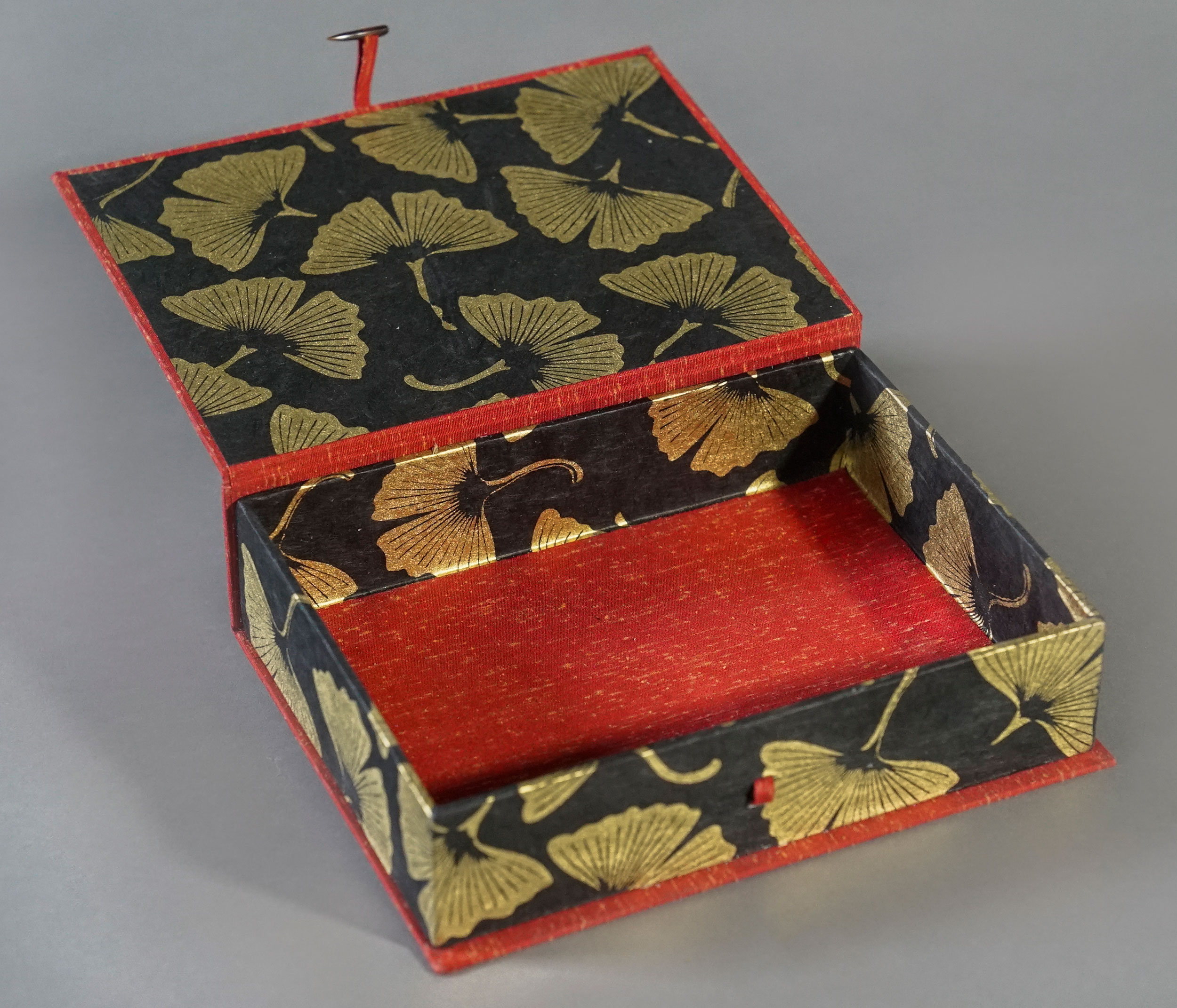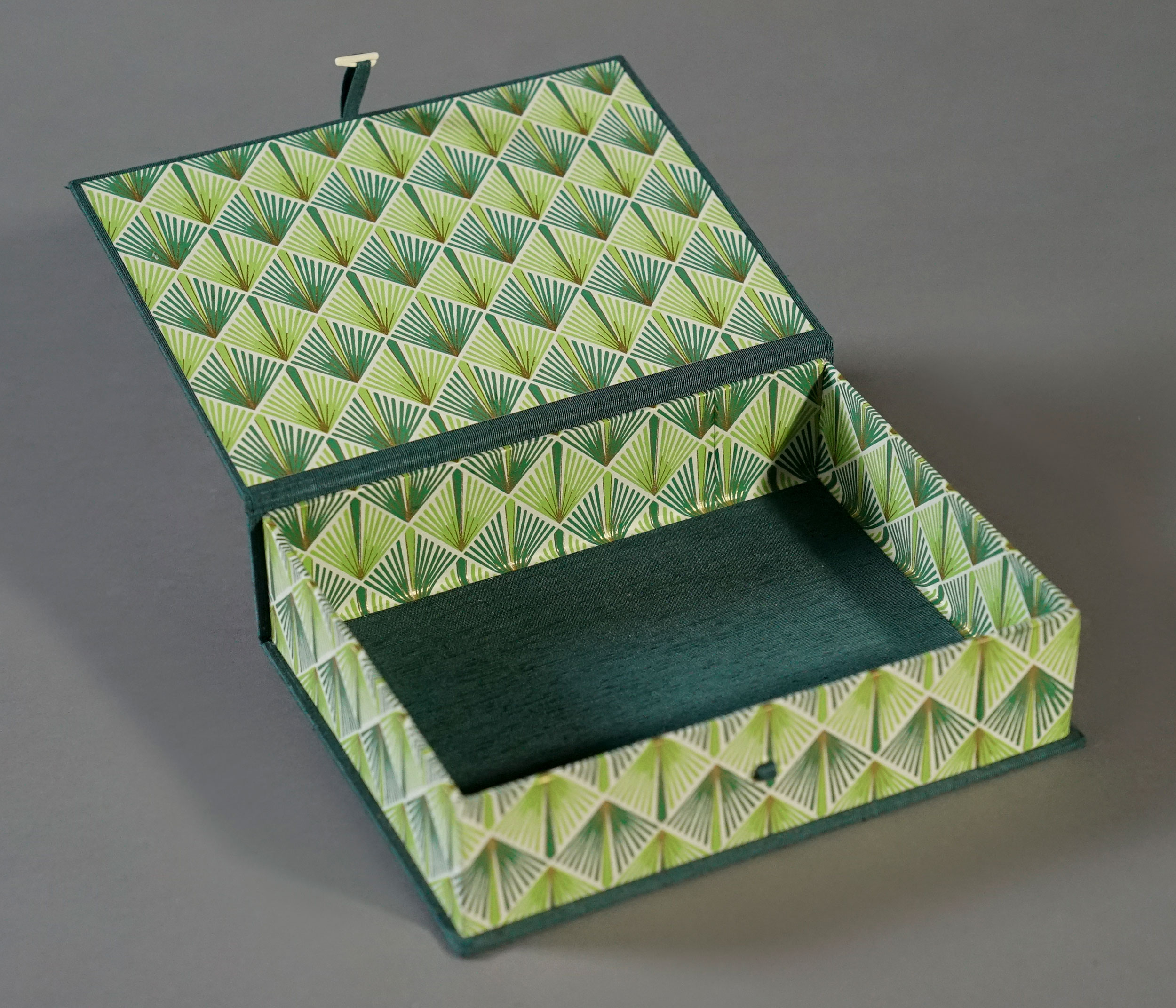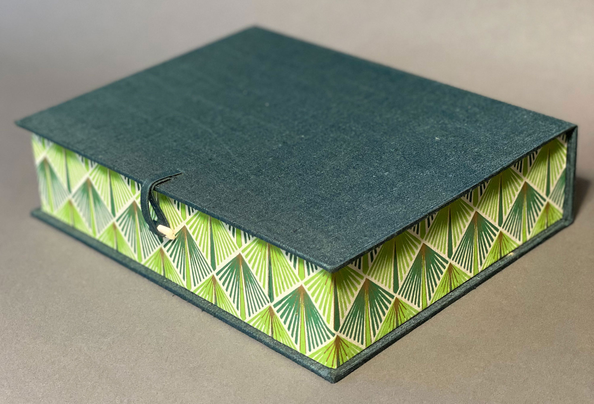 These boxes come in 3 different sizes and can accommodate all kinds of items from business cards (small) to books (large). They can also be ordered in custom sizes in a variety of unique papers.